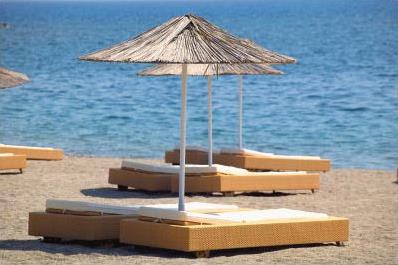 Plage privée de galets & 1 piscine extérieure avec chaises longues et parasols, centre de remise en forme en plein air, court de tennis.