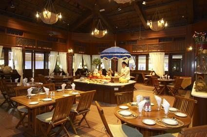 Un bel ensemble architectural construit dans le style d'un village malais traditionnel, au coeur d'un immense jardin tropical paysage.
